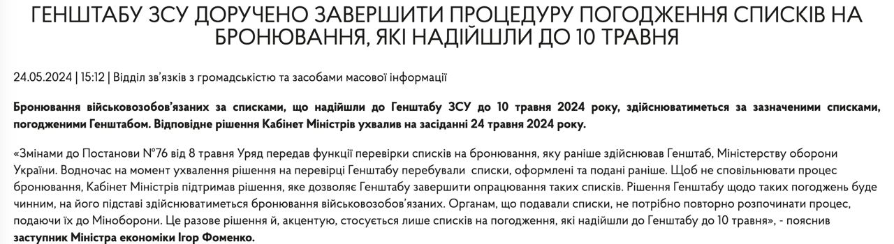 15.44 Кабмин поручил Генштабу ВСУ согласовать списки на бронирование, которые были переданы до 10 мая.