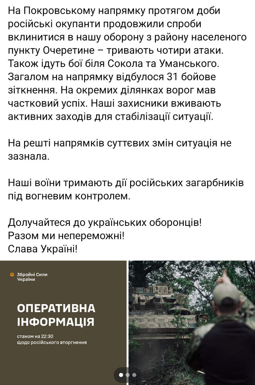 23:21 Генштаб ВСУ заявил о "частичном успехе" российских войск на Покровском направлении.