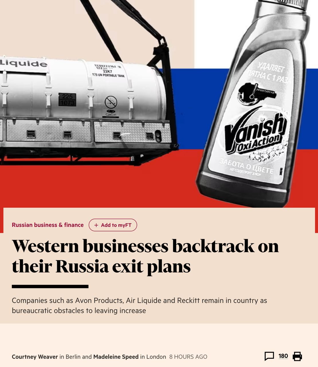 Многие западные компании отказались от планов уйти из России, поскольку "бюрократические препятствия растут, а потребительская активность восстанавливается". В частности, речь идет о компаниях Avon Products, Air Liquide и Reckitt, которые ранее озвучивали планы покинуть РФ.