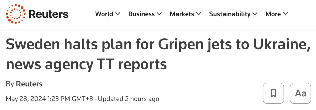 Швеция приостанавливает планы по отправке Украине самолетов Gripen, чтобы обеспечить возможность поставок и использования ВСУ истребителей F-16.