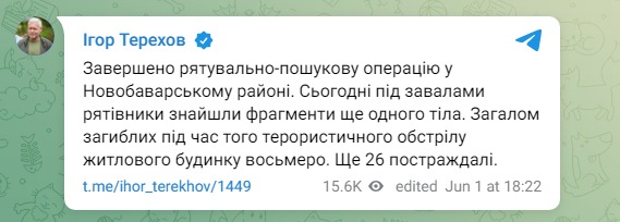 Вскоре после появлениия поста Синегубова мэр Харькова Игорь Терехов написал в Телеграме, что спасательно-поисковая операция в Новобаварском районе завершена. По его данным, в общей сложности погибших во время прилета по жилому дому восемь человек. Еще 26 пострадали.