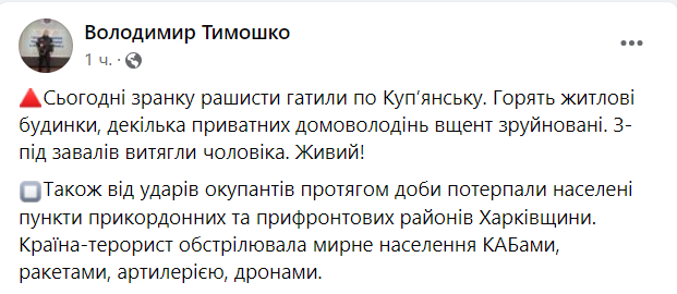 "Сегодня утром рашисты били по Купянску. Горят жилые дома, несколько частных домовладений полностью разрушены. Из-под завалов вытащили мужчину. Жив!", - написал он.
