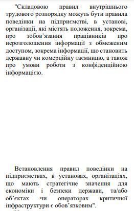 "В правила внутреннего трудового распорядка могут быть включены нормы поведения на предприятии, в учреждении, в организации, содержащие положения, в частности, об обязательствах работников о неразглашении информации с ограниченным доступом, информации, составляющей государственную или коммерческую тайну, а также об условиях работы с конфиденциальной информацией. Установление правил поведения на предприятиях, в учреждениях, организациях, имеющих стратегическое значение для экономики и безопасности государства, и/или объектах или операторах критической инфраструктуры, - обязательно", - гласит новая норма.