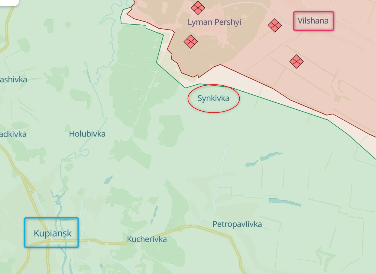 Российские военные паблики утверждают, что РФ атакует восточнее деревни Синьковка, продвигаясь к югу от Ольшаны. Украинские источники этого не подтверждали.