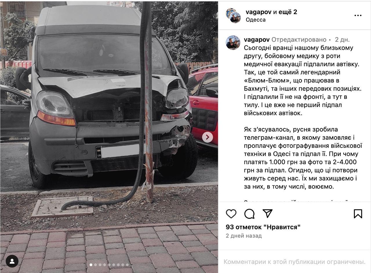 РФ создала паблик в Telegram, через который находит готовых поджечь военные авто в Одессе за деньги. Об этом заявил депутат Одесского горсовета Андрей Вагапов.