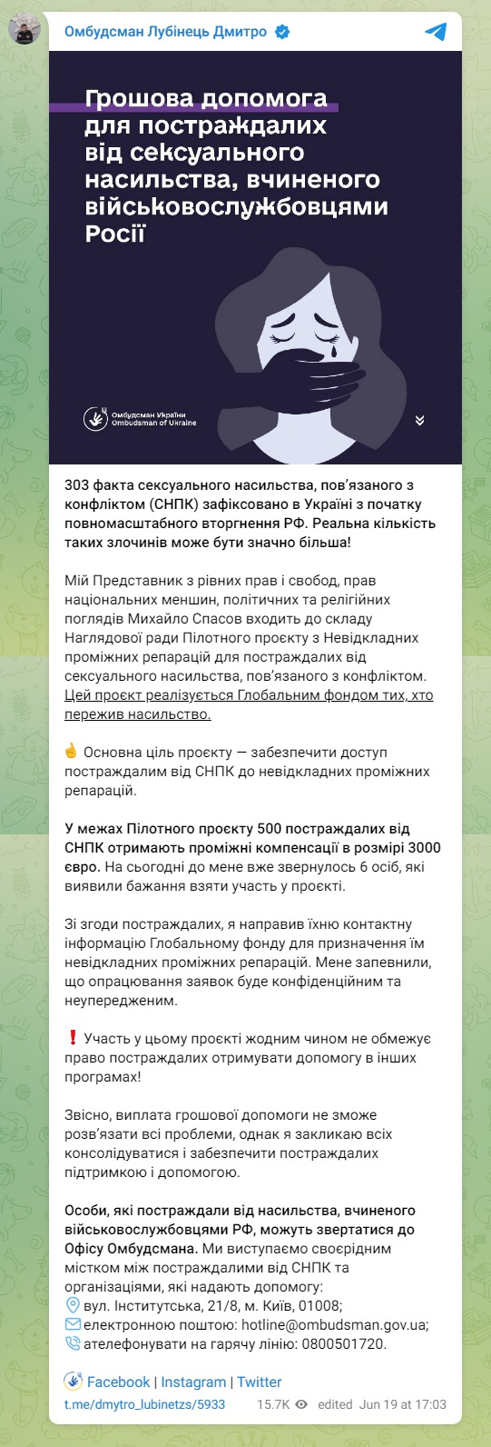 "В рамках пилотного проекта 500 пострадавших от сексуального насилия получат промежуточные компенсации в размере 3000 евро. На сегодняшний день ко мне уже обратились шесть человек, которые изъявили желание принять участие в проекте", - написал Лубинец.