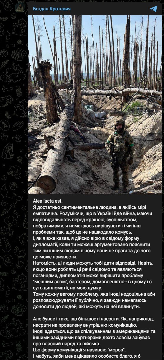 "Этот человек начинает расследование против наступающих и не теряющих позиции командиров, однако против себя он служебные расследования не инициирует. Меня это достало, Рубикон перейден", - написал военный.