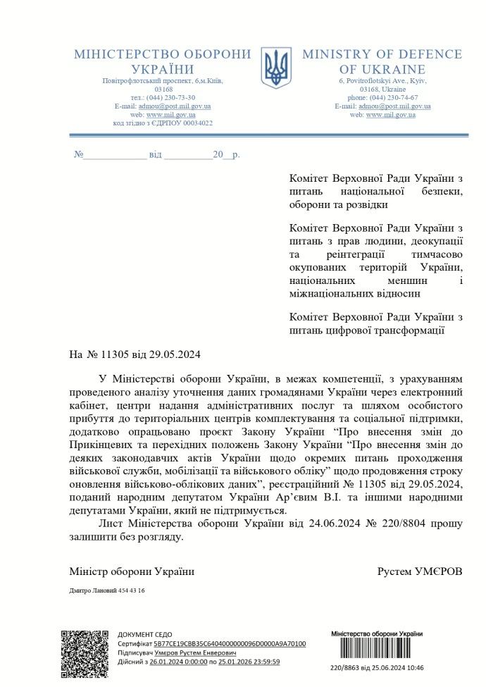 Минобороны Украины поддерживает продление срока обновления данных военнообязанными ещё на 90 дней.