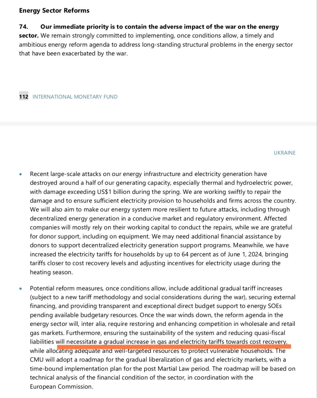 Как только война закончится, "потребуется постепенное повышение тарифов на газ и электроэнергию в целях возмещения затрат при одновременном выделении адекватных и целенаправленных ресурсов для защиты уязвимых домохозяйств".