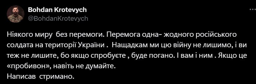 "Никакого мира без победы. Победа одна - ни одного российского солдата на территории Украины. Потомкам мы эту войну не оставим, и вы тоже не оставите, потому что если попробуете, будет плохо. И вам, и им. Если это "пробивон", даже не думайте. Написал сдержанно", - отметил военный.