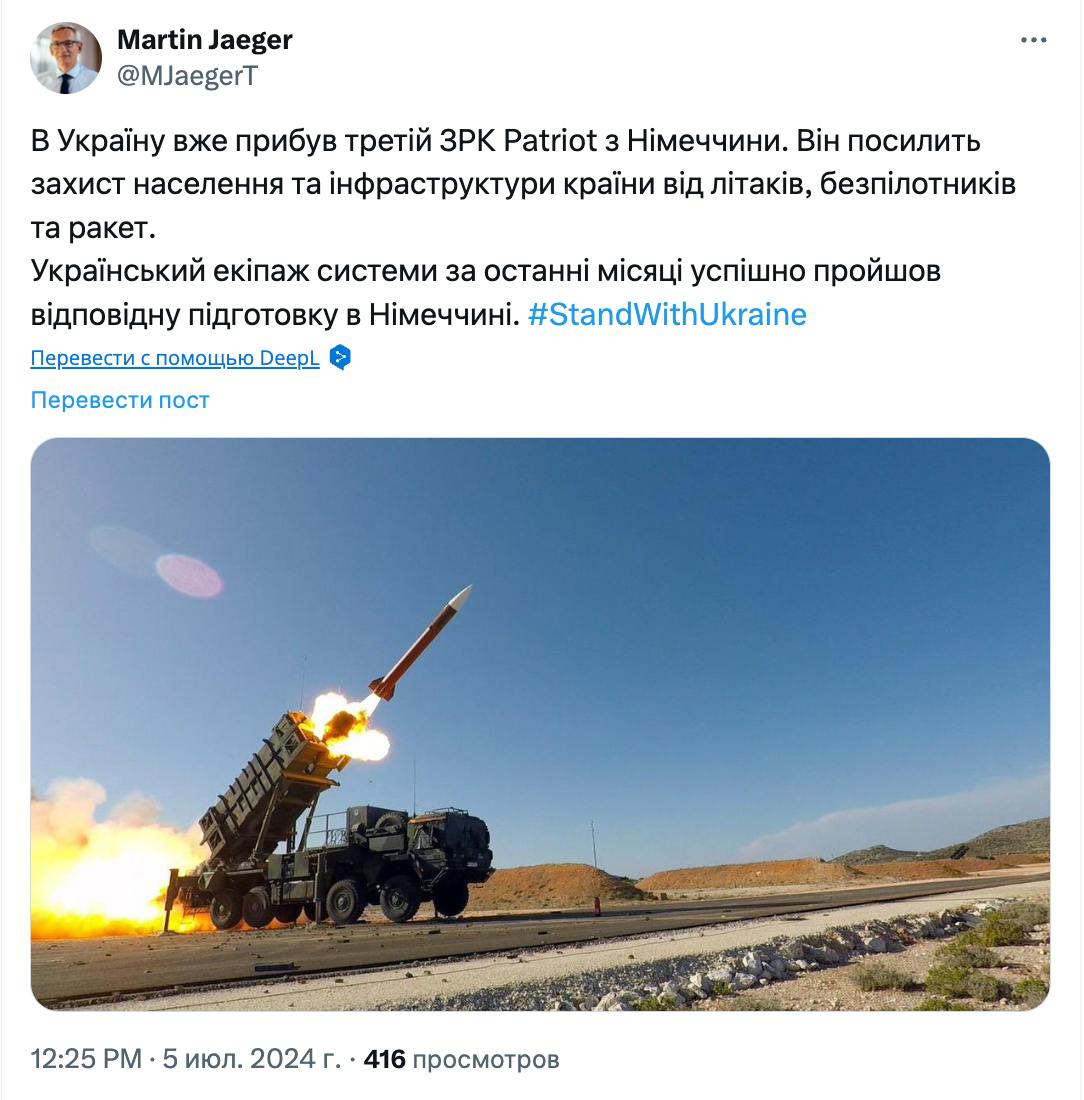 "В Украину уже прибыл третий ЗРК Patriot из Германии. Он усилит защиту населения и инфраструктуры страны от самолетов, беспилотников и ракет.