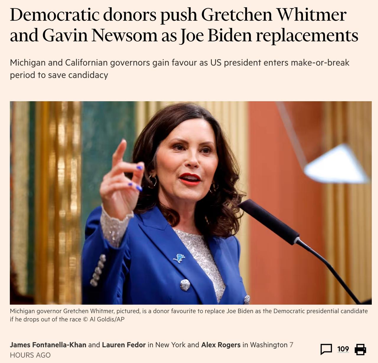 Спонсоры выдвигают кандидатами губернатора Мичигана Гретхен Уитмер и губернатора Калифорнии Гэвина Ньюсома. Также звучит имя Камалы Харрис. Больше всех поддержки у Уитмер.