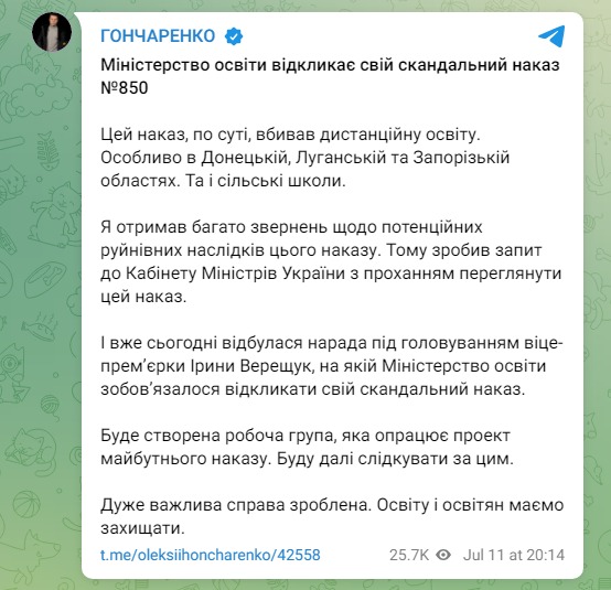 "Этот приказ по сути убивал дистанционное образование. Особенно в Донецкой, Луганской и Запорожской областях. Да и сельские школы", – объяснил он.