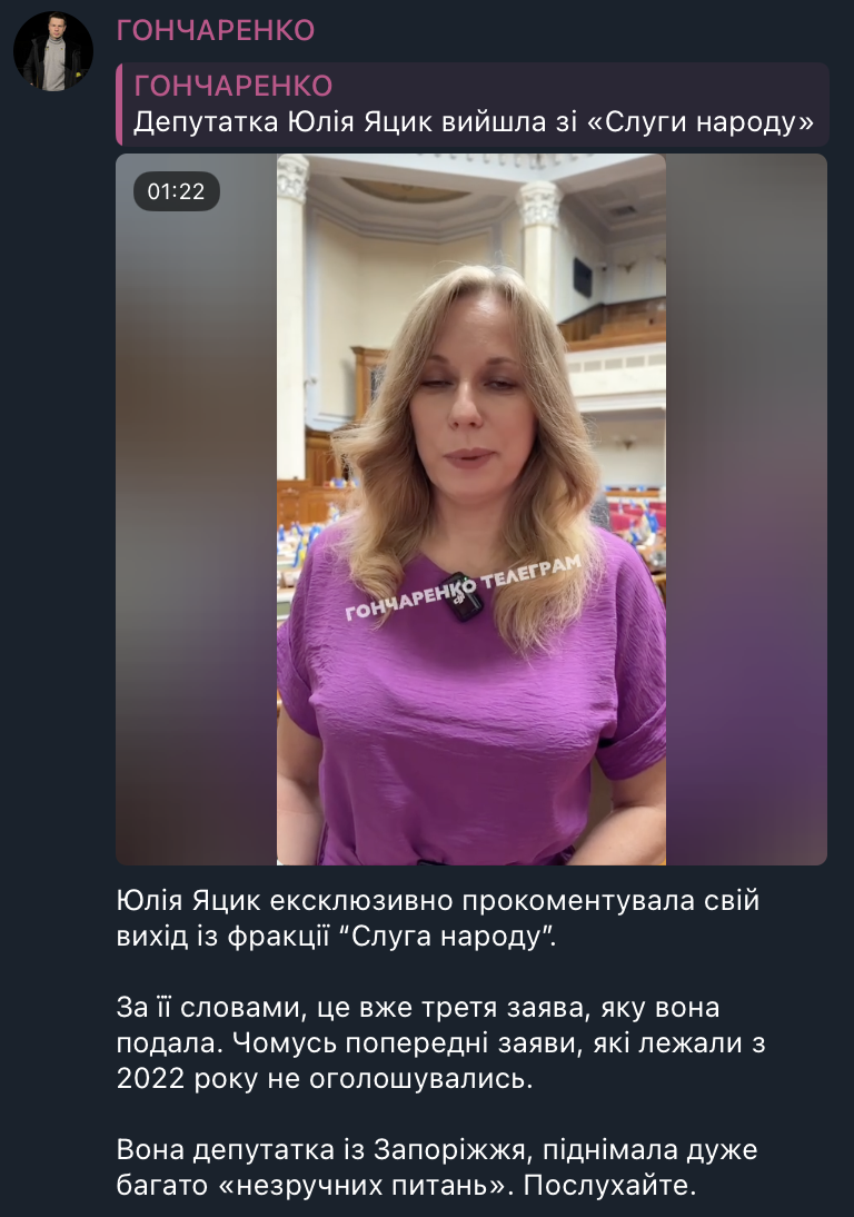 В комментарии нардепу Алексею Гончаренко Яцик заявила, что это была ее третья попытка выйти из фракции, а прошлые, которые лежали с 2022, не оглашались.