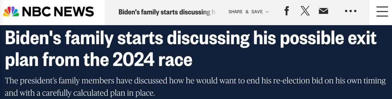 Сайт NBC со ссылкой на источники сообщил, что семья Джо Байдена уже обсуждает возможный план выхода президента из избирательной гонки. Сделать это хотят достойно для Байдена и выгодно для Демократической партии.