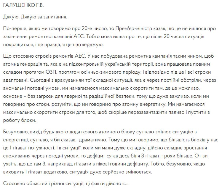 "Если мы говорим о 20-м числе, то премьер-министр говорил, что речь не шла об окончании ремонтной кампании АЭС. То есть речь шла о том, что после 20-го числа ситуация улучшится, и это правда, я это подтверждаю", – сказал министр.