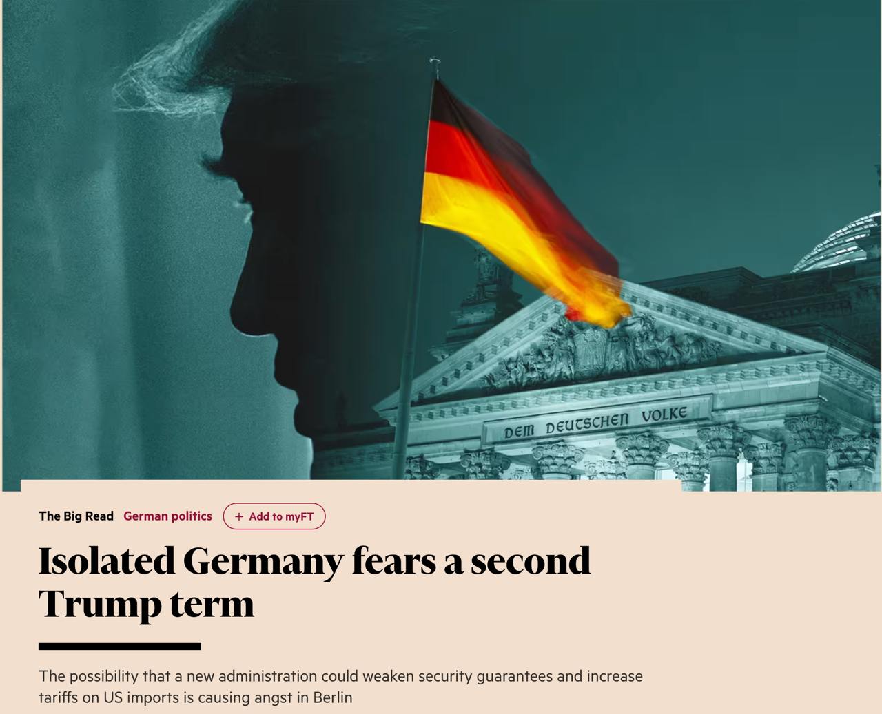 "Германия готовится к возвращению президента с еще более откровенно протекционистской, ориентированной на Америку экономической политикой, чем во время его первого срока, включая угрозу введения 10-процентной пошлины на весь импорт, что может нанести огромный ущерб экспортно-ориентированной экономике Германии", - пишет FT.