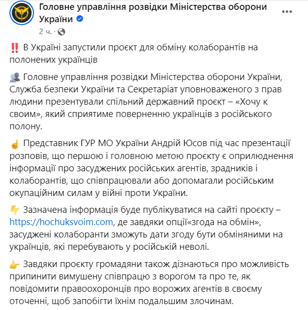 Также ГУР сообщает, что на сайте проекта будет отдельная форма, при помощи которой граждане смогут сообщить силовикам о "вражеских агентах в своем окружении".