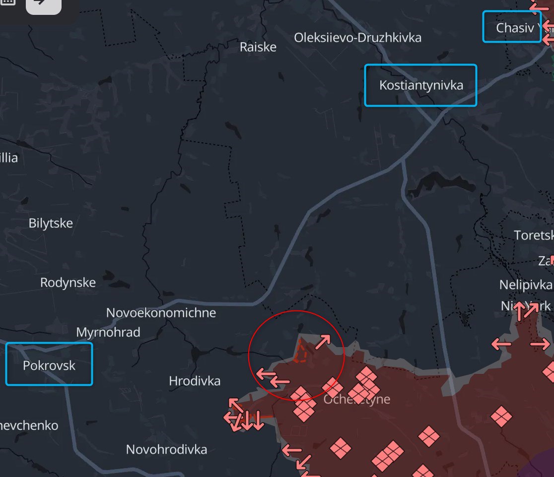 9.46 На Покровском направлении россияне продвинулись за сутки в трех местах - в сторону Воздвиженки (через которую можно выйти на трассу Покровск-Константиновка), в селе Веселом и возле Желанного.