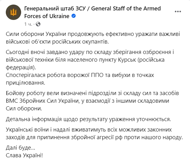 Силы обороны Украины нанесли удар по складу военной техники под Курском РФ. Об этом сообщает Генеральный штаб ВСУ.