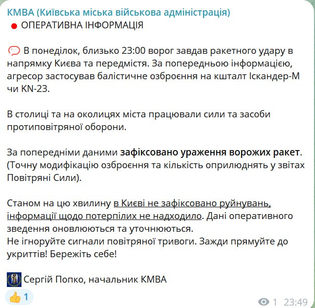 23.54 Киевская ГВА сообщает, что ракетный удар наносился «Искандерами», они сбиты.