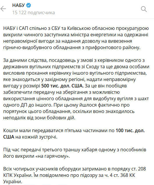 По версии следствия, чиновник требовал деньги от руководителя угольного предприятия на Западной Украине за вывоз горнодобывающего оборудования из прифронтового района с возможностью дальнейшего его использования.