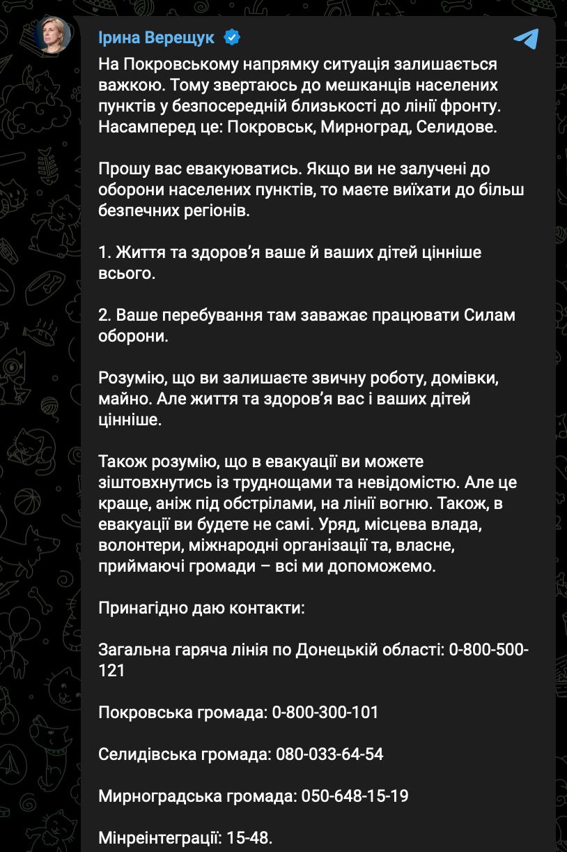 18:59 Из-за ухудшения ситуации на Покровском направлении жителям Селидово, Покровска и Мирнограда нужно выезжать из городов, заявила вице-премьер Ирина Верещук.