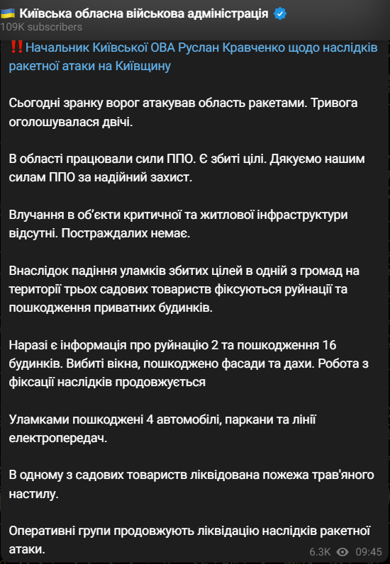 09:59 В Киевской области из-за падения обломков ракет и дронов пострадали 18 частных домов - два из них разрушены полностью.