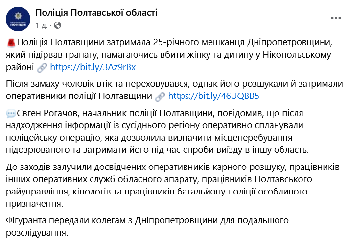 В Полтавской области поймали мужчину из Никополя, который бросил гранату в жену и ребенка