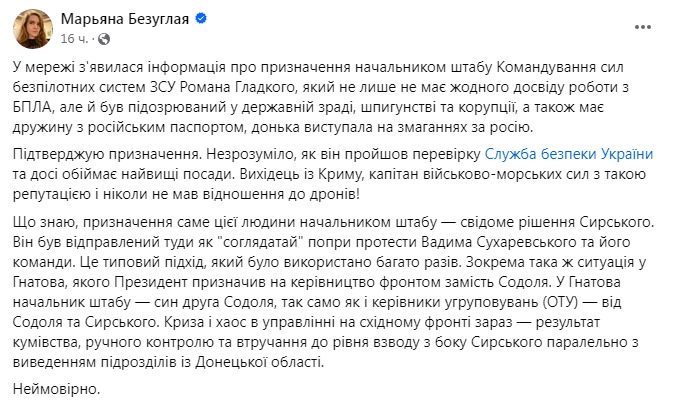 Народная депутат написала, что Гладкий "не только не имеет никакого опыта работы с БПЛА, но и подозревается в государственной измене, шпионаже и коррупции, а также имеет жену с российским паспортом", а его "дочь выступала на соревнованиях за Россию".