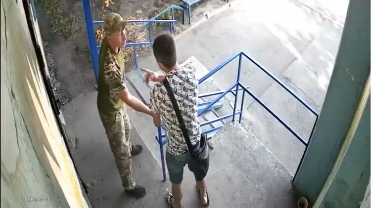 На опубликованном в Сети видео человек в военной форме избил мужчину около подъезда многоэтажного дома.