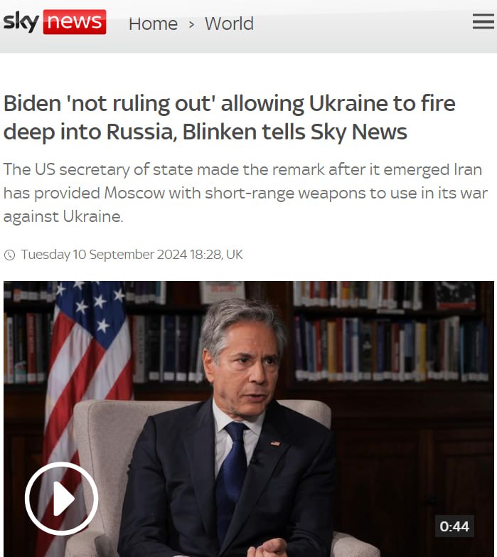 Сегодня Блинкен анонсировал, что 13 сентября Байден проведет встречу с премьер-министром Великобритании Киром Стармером, на которой одной из тем станет разрешение украинским силам бить вглубь по территории России западным оружием.