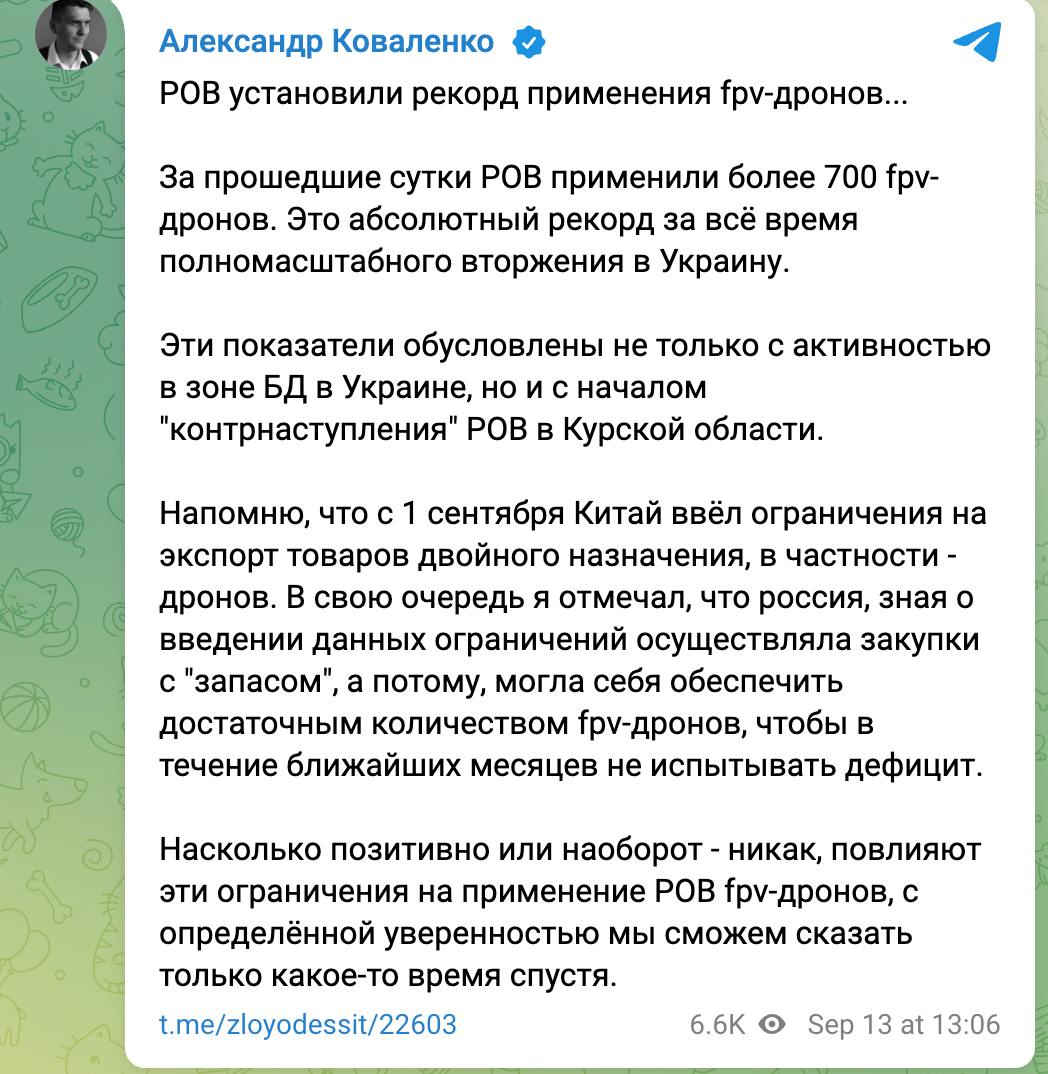 13.26 Россияне за минувшие сутки применили рекордное количество fpv-дронов - 700 единиц, сообщает эксперт "Информационного сопротивления" Александр Коваленко.