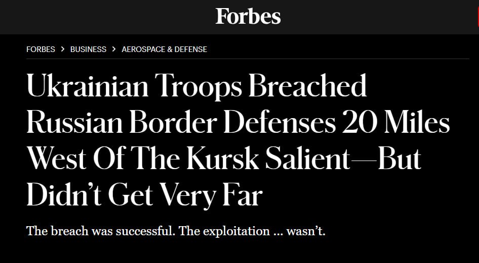 «Тот факт, что украинские войска, прорвавшие российскую оборону к югу от Нового Пути, по-видимому, не смогли продвинуться далеко, остановленные минными полями и российской бомбардировкой, может означать, что этот сектор не является «слабым местом» российской обороны, констатирует Forbes.