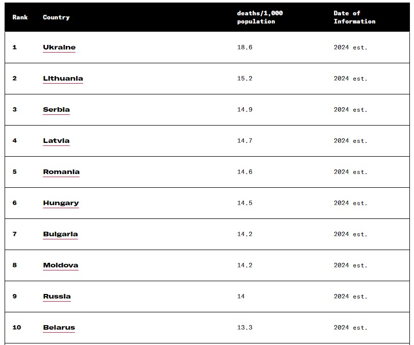 Согласно сводным таблицам по странам, в этом году в Украине смертность составляет 18,6 на 1000 человек. По этому показателю Украина стоит на первом месте. За ней в первой десятке расположились: