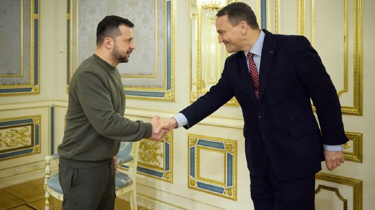 Президент Украины Владимир Зеленский встретился с министром иностранных дел Польши Радославом Сикорским в пятницу в Киеве.