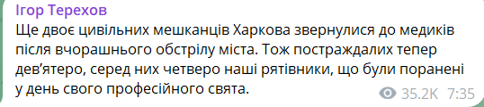 08:15 Еще двое гражданских жителей Харькова обратились к медикам после вчерашнего обстрела города, написал мэр Игорь Терехов.