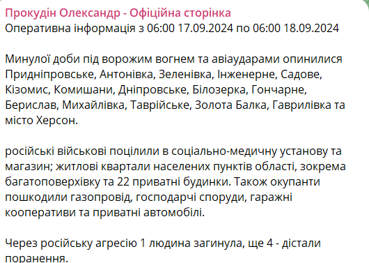 08:20 За прошедшие сутки в Херсонской области в результате российских обстрелов 1 человек погиб, еще 4 - получили ранения.