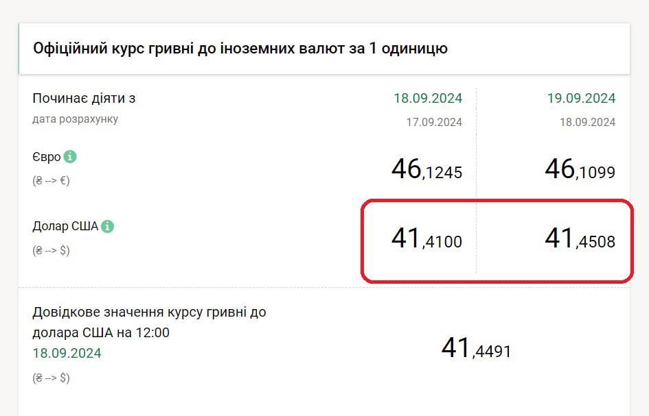 По итогам среды Нацбанк поднял свой официальный курс с 41,41 грн/$ до 41,45 грн/$ (установлен на 19 сентября).