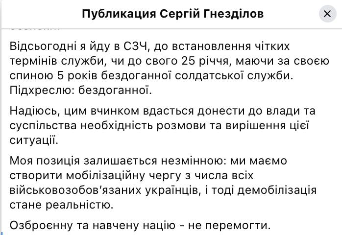 Военный 56-й бригады ВСУ Сергей Гнездилов через Facebook сообщил, что уходит в СОЧ (СЗЧ - укр.) - то есть в самоволку.