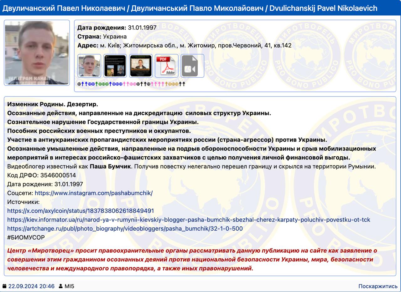 После этого блогера внесли на "Миротворец" как "изменника родины" и "дезертира".
