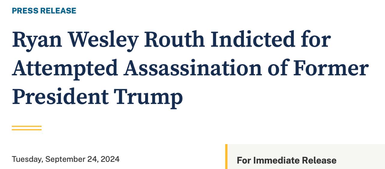 "Бывший президент Трамп играл в гольф в Trump International 15 сентября, и агент Секретной службы, проводивший зачистку периметра, увидел частично скрытое лицо человека, позже идентифицированного как Рут, в кустах вдоль линии забора возле шестой лунки. Агент наблюдал за стволом винтовки, направленным прямо на него. Когда агент начал отступать, он увидел, как ствол винтовки двигается, и агент выстрелил в Рута.