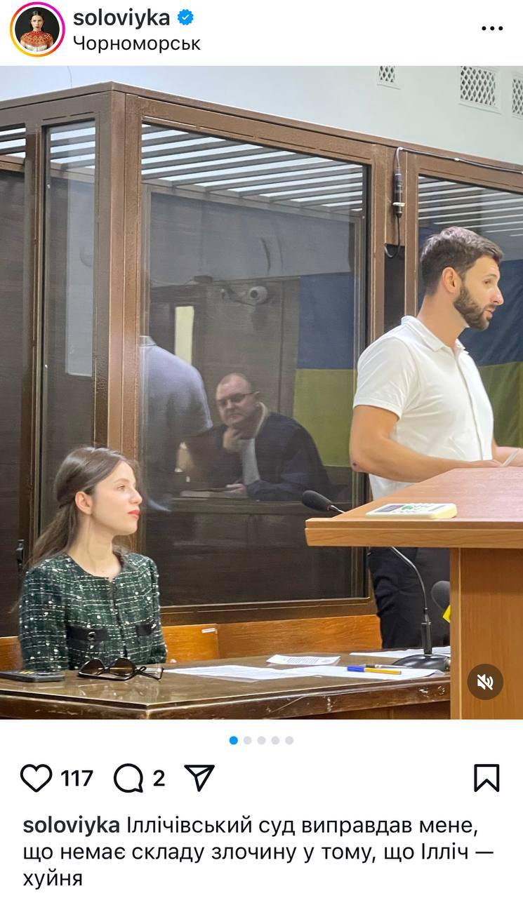 "Ильичевский суд оправдал меня, что нет состава преступления о том, что Ильич — ху@ня", - прокомментировала событие Соловий в соцсети.