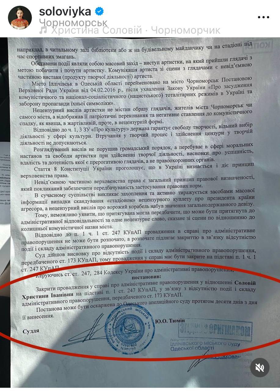 Ильичевский городской суд Одесской области оправдал певицу Кристину Соловий, которая на концерте в этом населенном пункте назвала его старое название Ильичевск "полной ху@ней". Артистке инкриминировали мелкое хулиганство.