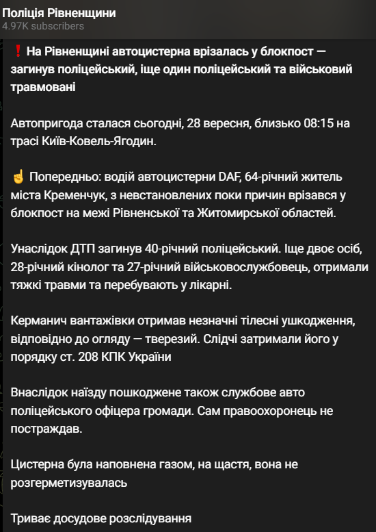 Сегодня утром автоцистерна с газом врезалась в блокпост на границе Ровенской и Житомирской областей. Погиб полицейский.