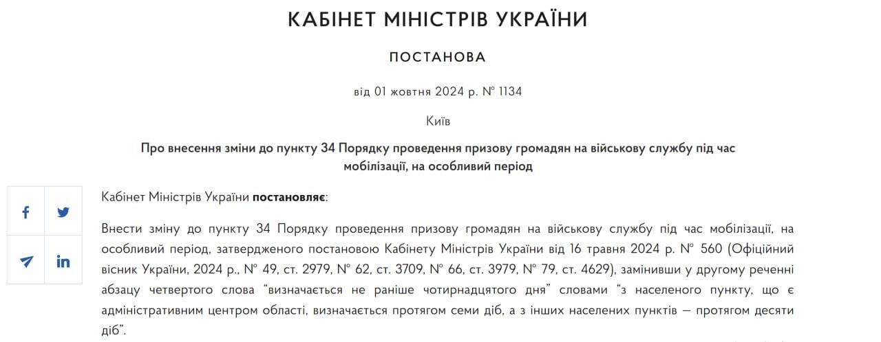 "Внести изменение в пункт 34 порядка проведения призыва граждан на военную службу во время мобилизации на особый период, утвержденного постановлением Кабинета министров Украины от 16 мая 2024 г. № 560, заменив во втором предложении абзаца четвертого слова "определяется не раньше четырнадцатого дня" словами "из населенного пункта, являющегося административным центром области, определяется в течение семи суток, а из других населенных пунктов - в течение десяти суток", - сказано в документе.