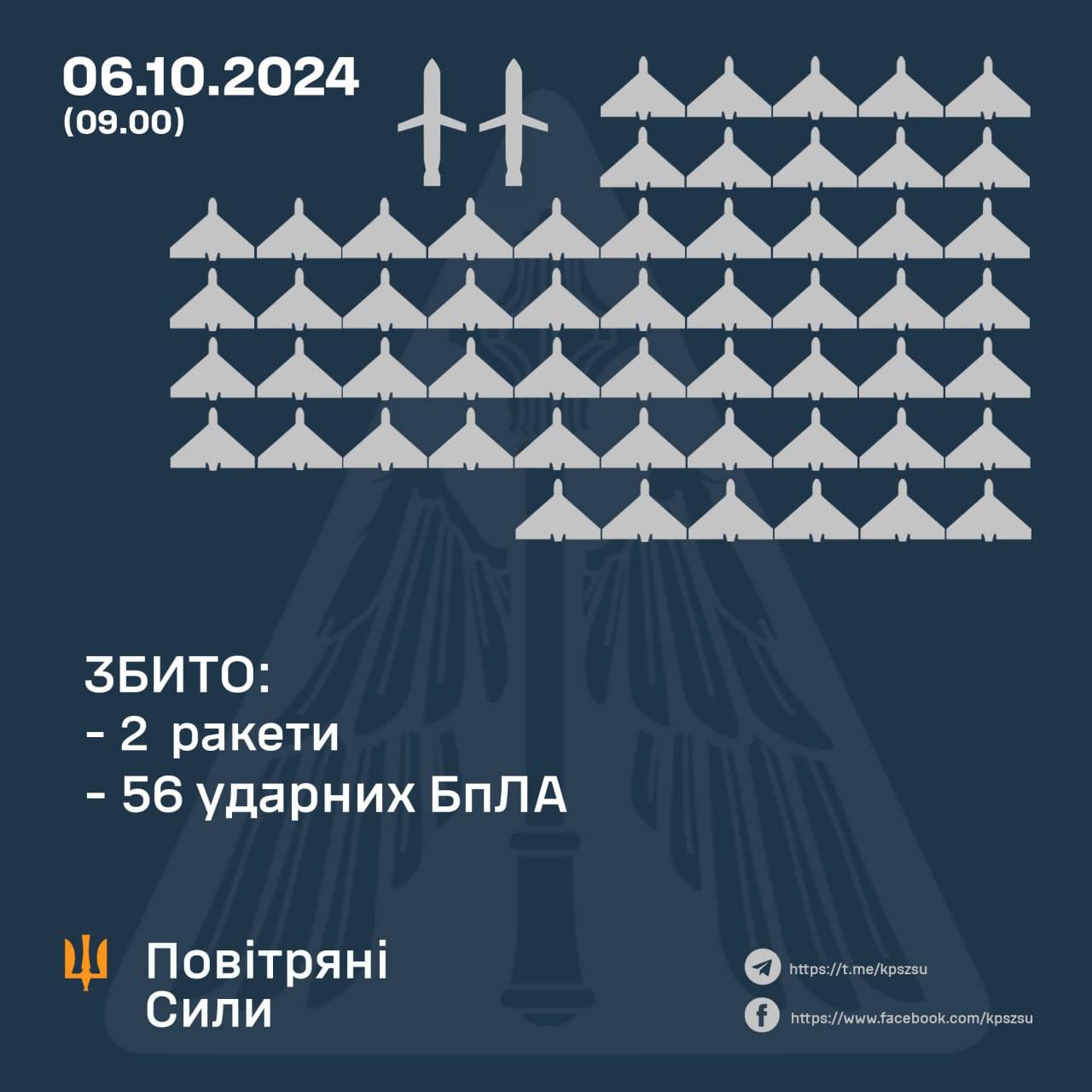 09:50 Ночью из 87 "Шахедов" Украина сбила 56, сообщают Воздушные силы ВСУ.