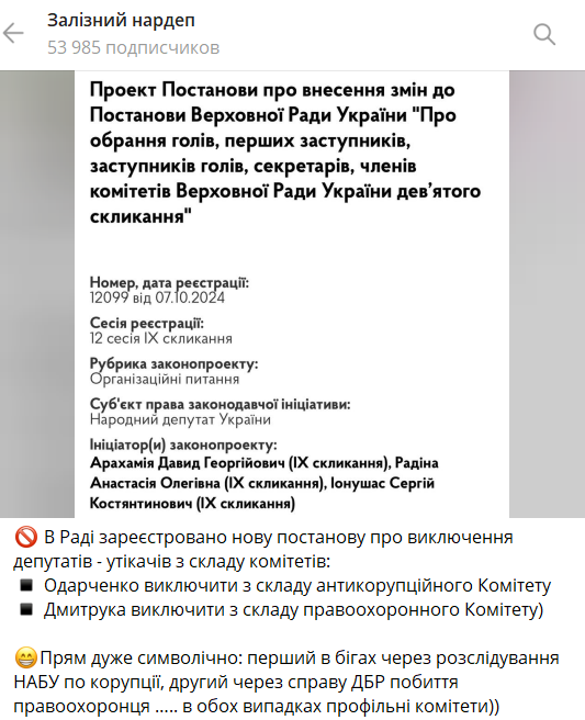 Об этом сообщил народный депутат Ярослав Железняк в своем телеграм-канале.