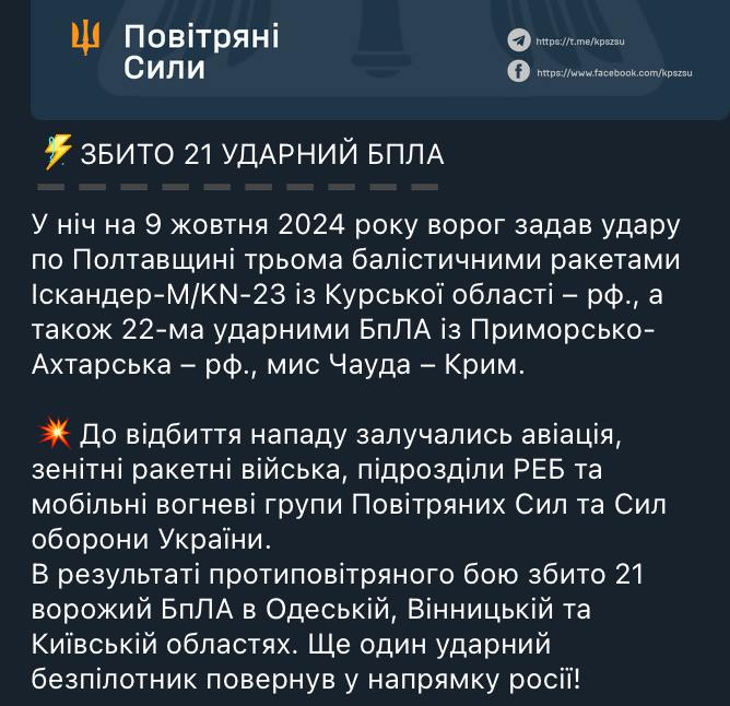 Об этом сообщают Воздушные силы. Ракеты сбить не удалось, при этом были уничтожены почти все "Шахеды" (как утверждается, 21 из 22-х).