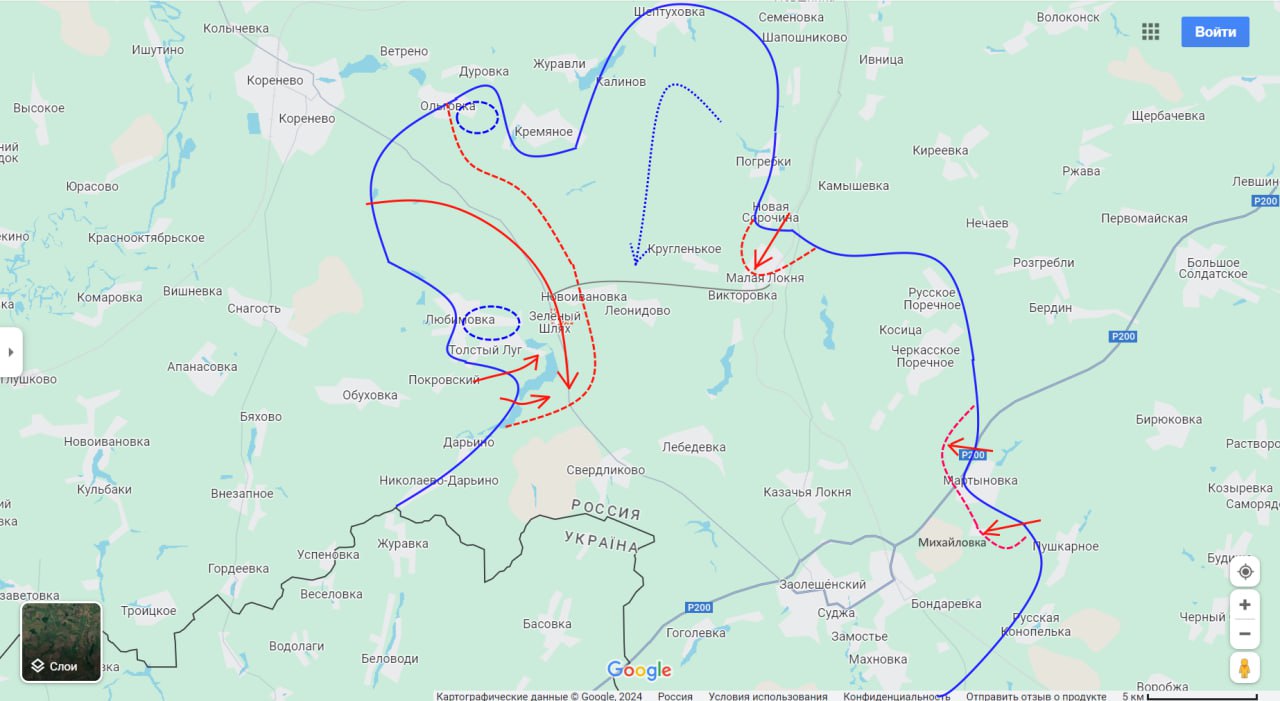 Российские паблики пишут, что Зеленый шлях уже занят и идут бои за Любимовку и Новоивановку, а в северной части подконтрольного Украины плацдарма в Курской области (в районе Ольговки) часть украинских подразделений оказалось в окружении.
